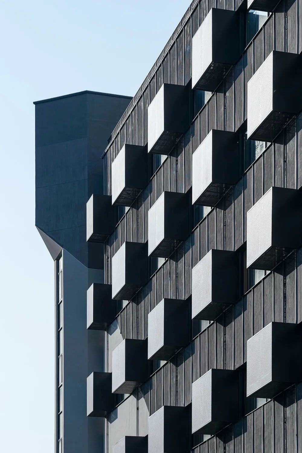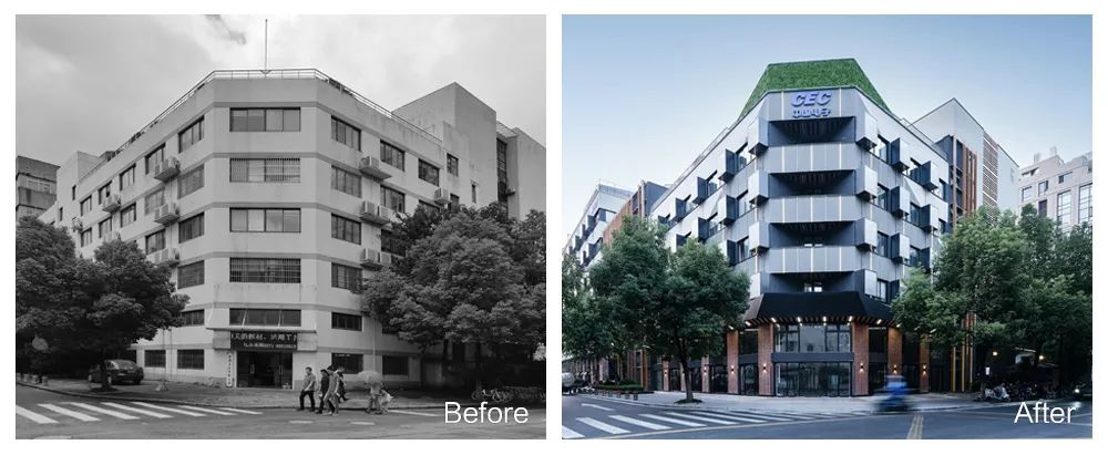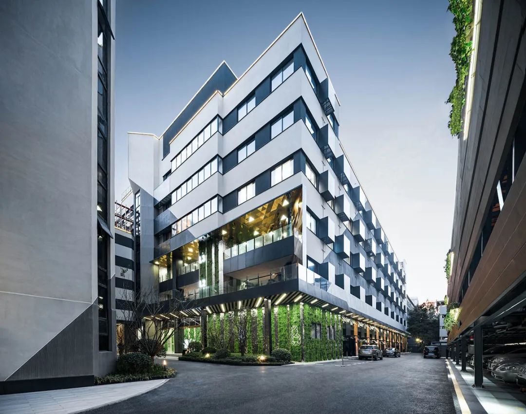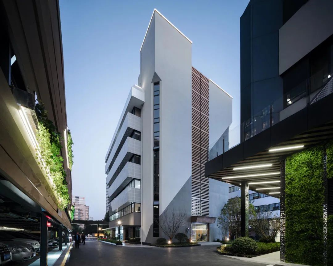 同时继续运用三角元素,配以彩色不锈钢板、水纹不锈钢板、绿化墙和LED屏,以此实现科技与自然并重。