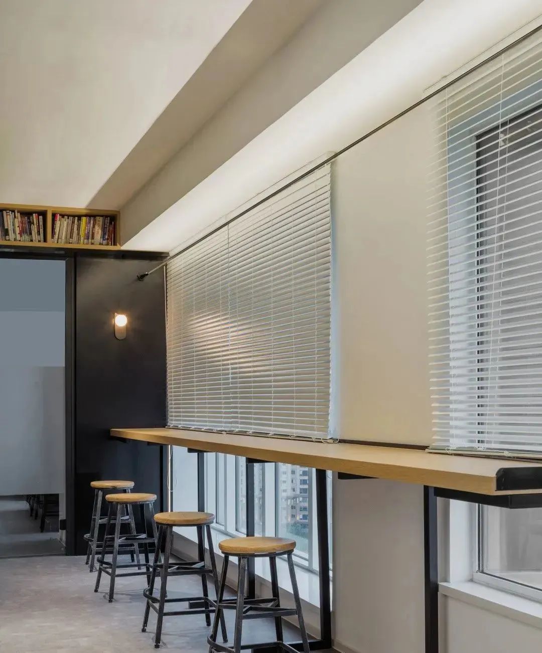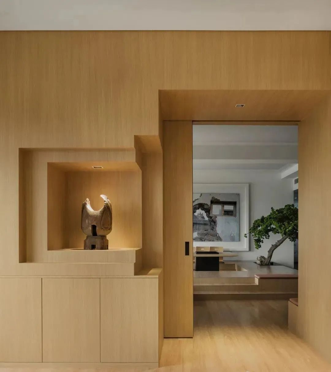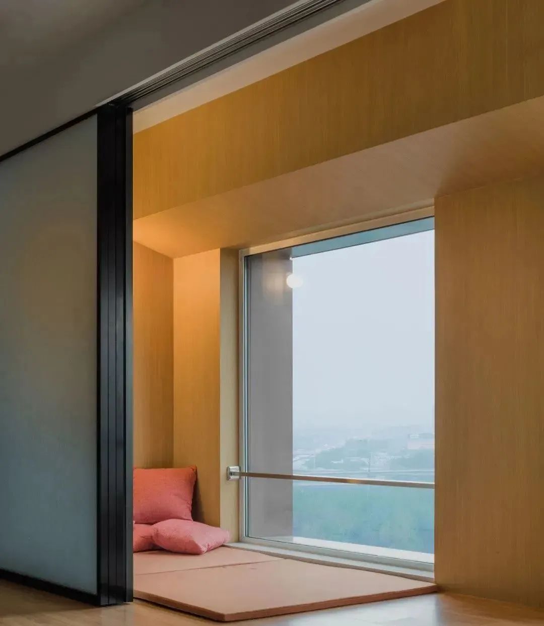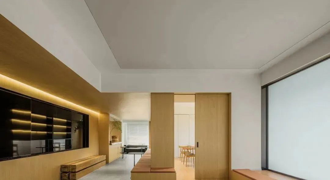 外窗与前厅之间有一道推拉移门,门关上时可以形成静谧的冥想室和休息区。