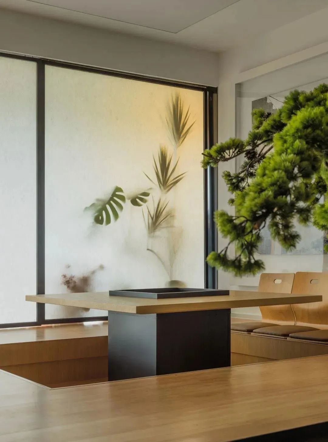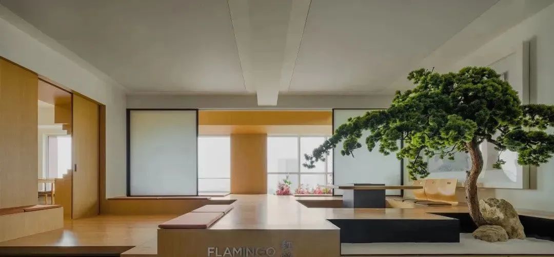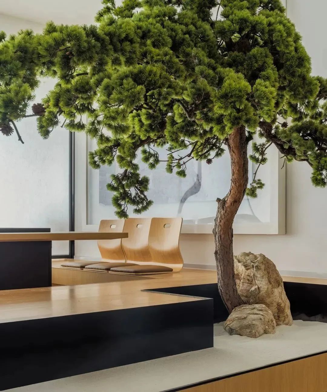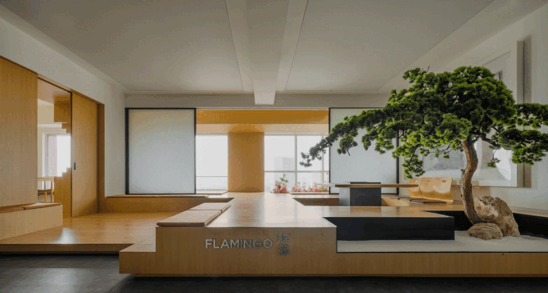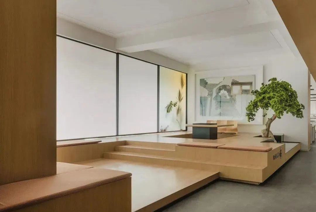 在进门处设置松树景观,融合了自然景观和人文景观,让人仿佛置身于园林之中,瞬间从繁忙的工作中放松下来,诗情画意,一步一景,好不惬意。