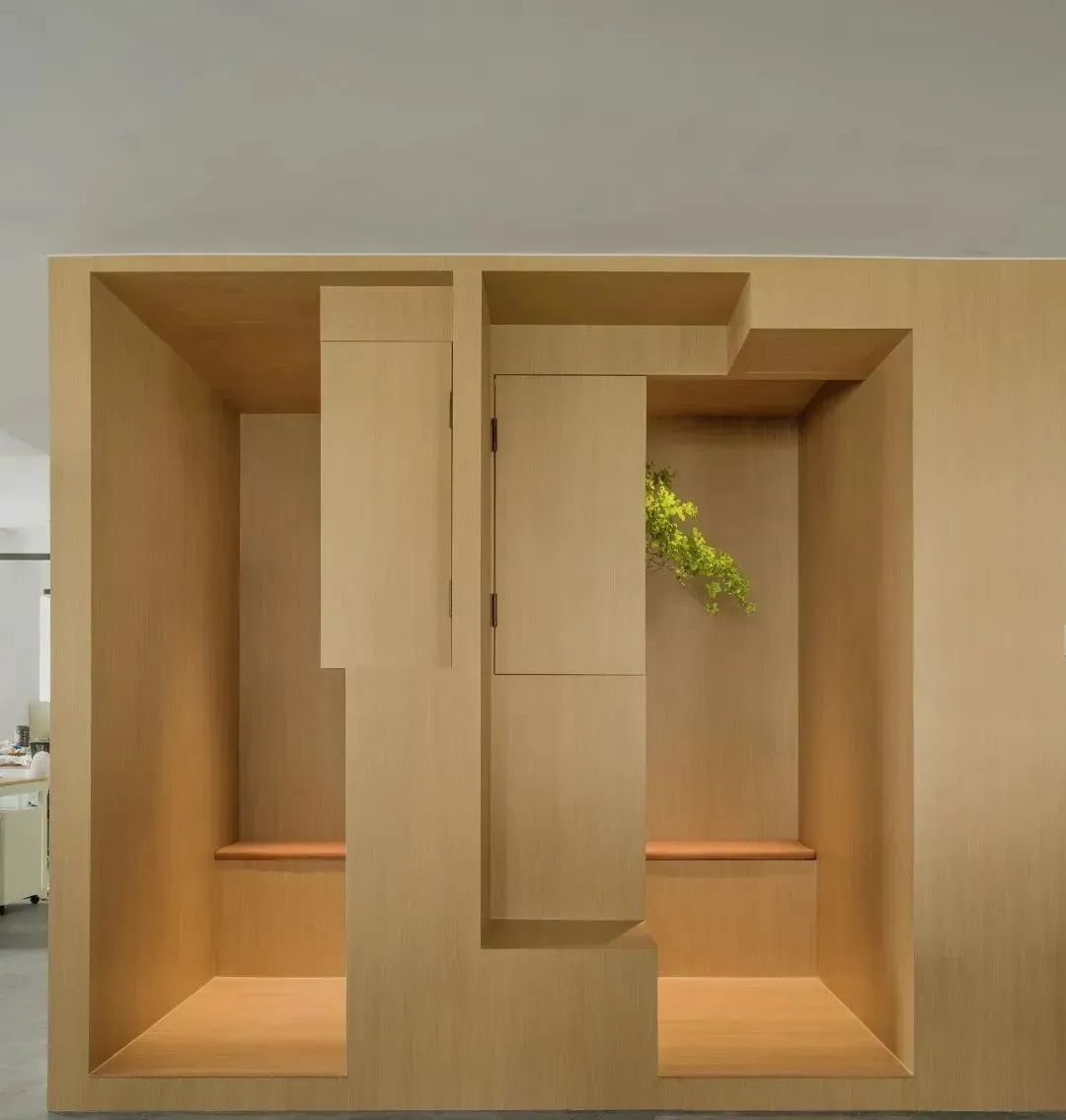办公空间中大面积的使用了原木元素,加以植物景观作为点缀,统一自然与人文,整体细腻而富有诗意。形成极具东方意境的空间氛围。