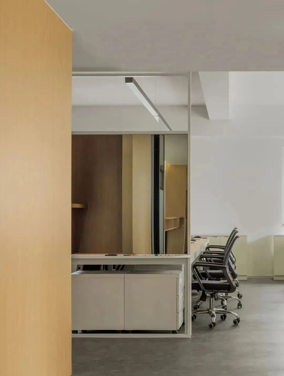 中灰色亚麻的地板延展至各个办公区,与立面顶面的木色和白色元素,形成冷暖碰撞,却又异常和谐。