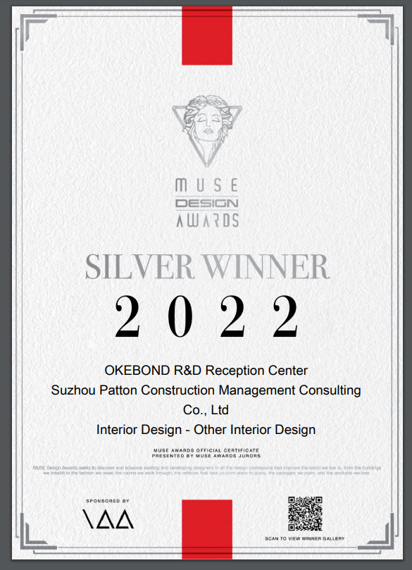 近日,全球建筑与设计领域最具影响力的国际奖项之一,美国缪斯设计奖(MUSE DESIGN AWARDS)公布了2022年度最终获奖名单。以总经理李思灿先生为代表的苏州邦通建设管理PattonCMC的参赛作品:「OKEBOND R&D Reception Center」,在来自全球逾6000部作品中脱颖而出,荣获银奖!
